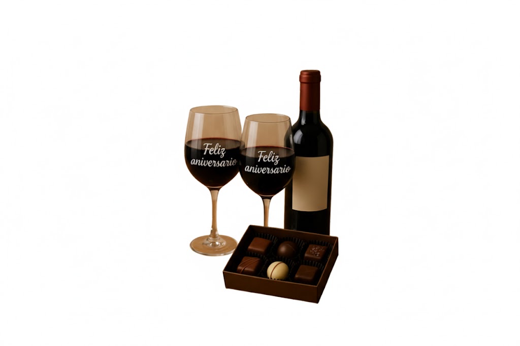 Celebra los logros y los años de amor con un brindis sofisticado. Este kit es la invitación perfecta a una noche de celebración en pareja. La Botella de vino tinto joven es el centro de la fiesta, acompañado por el detalle personalizado de una Copa de vino grabada. Los chocolates artesanales añaden el toque gourmet.