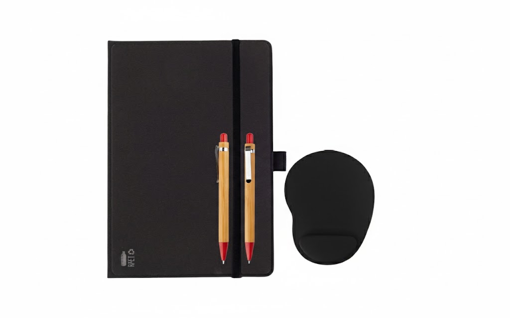 Un set esencial que eleva el día a día en la oficina, combinando funcionalidad, diseño y un compromiso consciente. Ideal para onboarding o reconocimientos de alto nivel que buscan proyectar una imagen profesional y sostenible (gracias al material RPET de la libreta y el bambú del bolígrafo).